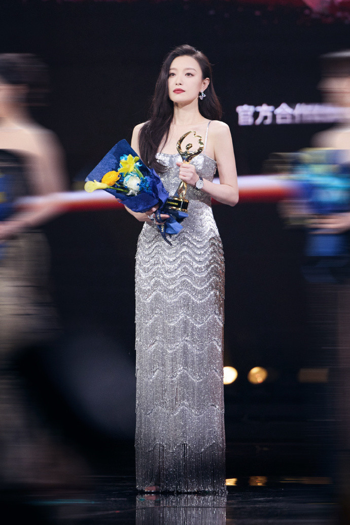她耳朵上佩戴了银色镶钻耳环,不仅修饰了脸型,还与裙身的流苏设计形成了和谐的统一。