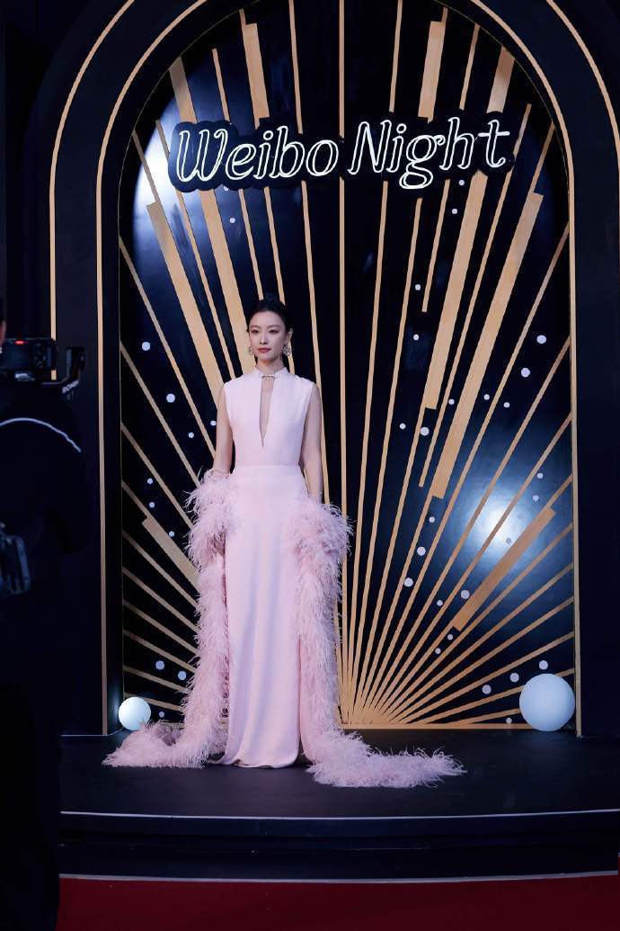 内搭羽毛披长款披肩,与粉色长裙形成了鲜明的对比,让人眼前一亮。